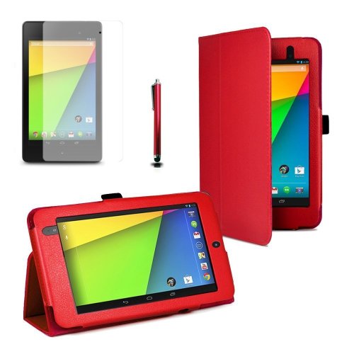 Zeba® Google Nexus 7 FHD Tablet 2nd Generation (16GB,32GB, Wi-Fi or 32GB 3G HSPA+) July 2013 Model Slim Fit Executive Multifunktions-Tablethülle, Rot PU-Leder, mit Ständer, mit eingebautem Magnet für Sleep/Wake Funktion, inklusive Displayschutzfolie und Stylus-Stift SALE